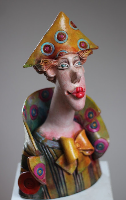Ceramika artystyczna, rzeźba ceramiczna malowana na zimno, prezentująca popiersie tukana w kapeluszu. rękodzieło, sygnowana ANNAART, 2025